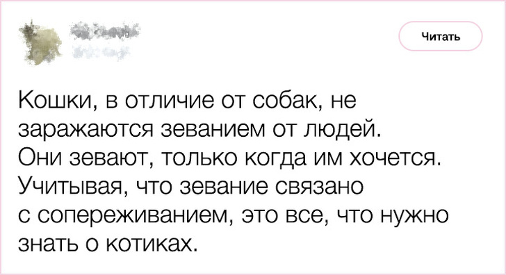 - У кішок досить одноманітне почуття гумору. Воно спрямоване на інших кішок і в основному полягає в розіграшах із серії «зараз я налякаю його, і він ка-а-а-ак підскочить!». Налякав кіт частенько йде вкрай задоволеним собою.