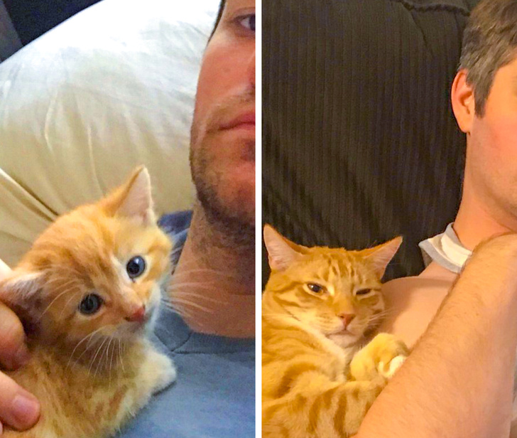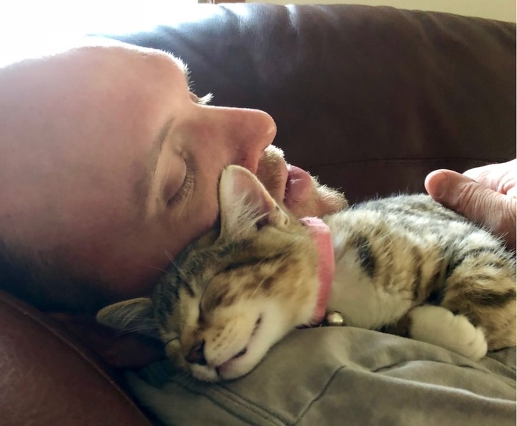 «Чоловік підібрав на вулиці дуже маленького кошеняти і дбав про нього круглі добу. Через рік кіт все ще думає, що мій чоловік — його мати. Так мило»