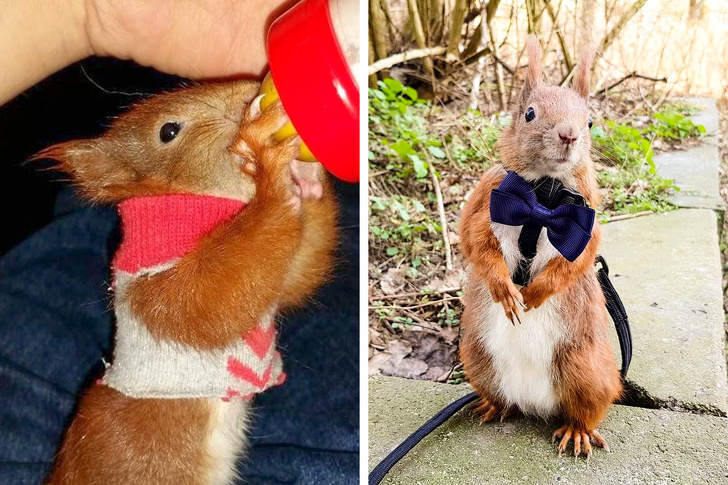 Крихітний білченя впав з висоти 4-го поверху, вдарившись об гілку, яка залишила на його грудях величезну рану. Мама-білка спустилася до свого малюка, обнюхала його, помацала лапкою і втекла, мабуть, вирішивши, що він не виживе. Декан Андерс, господар саду, який спостерігав усю цю картину, не зміг залишити дитину помирати і забрав його додому. Завдяки саморобної футболці з носка Тінтін не міг розчісувати рану, але знадобилося майже півроку, щоб вона повністю зажила. За цей час білченя повністю одомашнили і сьогодні навіть «веде свій блог, де можна почитати його історію і дізнатися, як їй живеться зараз.