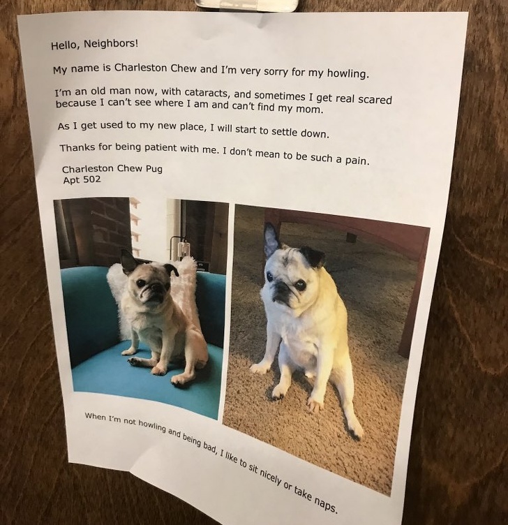 «Привіт, сусіди! Мене звуть Чарльстон Чу, і мені дуже шкода, що я вию. Я дідок, у мене катаракта, і іноді мені дуже страшно, тому що я не бачу, де знаходжуся і де моя мама. Коли я звикну до нового місця, я заспокоюся. Спасибі за ваше терпіння. Я не хотів бути таким покаранням для вас.