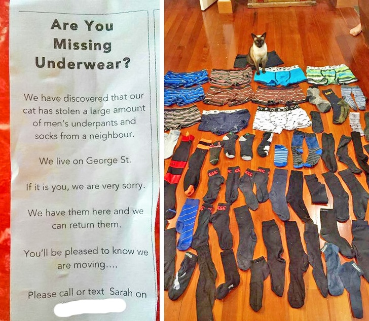 Ми виявили, що наша кішка вкрала цілу купу чоловічих трусів і шкарпеток. Ми живемо на Джордж-стріт. Якщо у вас щось поцупили, нам дуже шкода. Ми зберегли всі речі і можемо їх повернути. Ви зрадієте новини про те, що ми переїжджаємо.