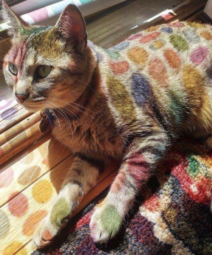 «Мій акваріум зламався, і скло відкидало кольоровий світ в куток вітальні. Бейлі ліг саме туди. Представляю вам Райдужного Кота»