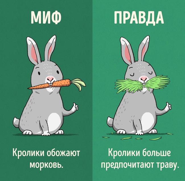 Завдяки кролику Багзу Банні цей міф став дуже стійким. Звичайно, кролики їдять моркву, але більше воліють траву і зелені листові овочі.