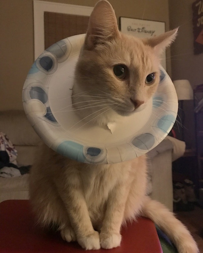 Кіт відмовляється носити захисний комір, але тарілка — це зовсім інша справа!