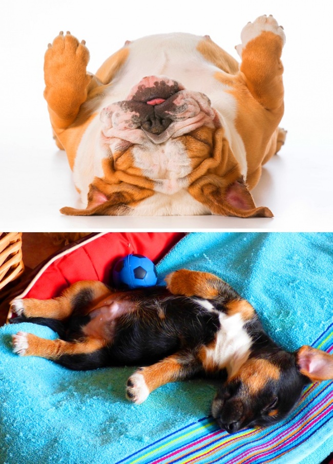 Сама розслаблена поза у собак: відкриті горло і живіт — найбільш уразливі частини тіла. Якщо вихованець спить на спині, це говорить про повну довіру і комфорт у вашій присутності. Але також це може означати, що собаці жарко або вона витратила багато енергії за день. Якщо ваш вихованець часто вибирає таку позу, значить, він упевнений в собі і легко адаптується до різних умов.