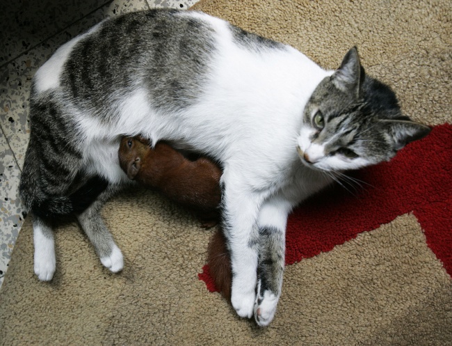 У Колумбії в парку Рубен Гавириа врятував пораненого бельчонка і віддав на виховання своїй кішці, яка в цей час годувала ще й своїх кошенят. Приемыша досить охоче прийняли, і малюк незабаром зміцнів.