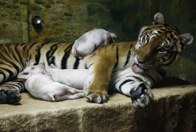 Тигриця в тайському зоопарку, сама виплекана коли-то свинею, стала мамою для декількох поросяток, після того як втратила власних малюків, що народилися раніше терміну.