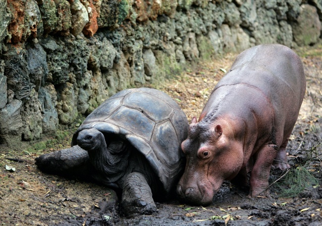 У парку Момбаса в Кенії врятували після цунамі маленького бегемотика, відірвався від своєї сім'ї. 300-кілограмовому бідоласі дали кличку Оуен і підселили у вольєр до 130-річної черепасі Мзи. Спочатку Мзи не сподобалося таке сусідство, але потім його серці потеплішало, і протягом цілих двох років Мзи був наставником Оуена. Історія цієї пари настільки знайома, що їй присвячені книги і цілий сайт.