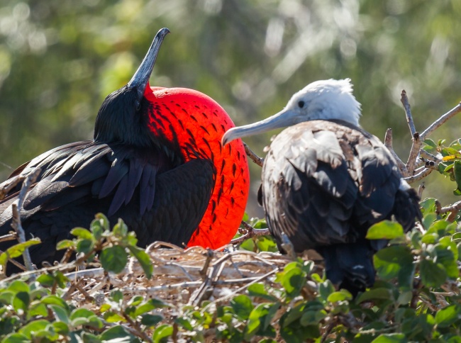 Зустрівши свою половинку, фрегату потрібно набрати побільше повітря в легені в буквальному сенсі. Щоб партнерка відповіла взаємністю, він роздмухує червоний горловий мішок, схожий на величезне серце. Супроводжуючи це змахами крил і шлюбними співами, він терпляче чекає прихильності партнерки. Якщо дама згодна, вона треться головою об горловий мішок фрегата. І це значить, що шлюбний союз здійснився.