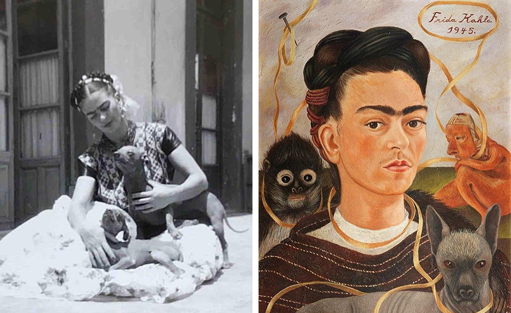 Після хворобливого розриву з чоловіком Фріда Кало почала зображати себе в оточенні тварин. Вона дуже любила братів наших менших і тримала собак, мавпочок, папуг і голубів.