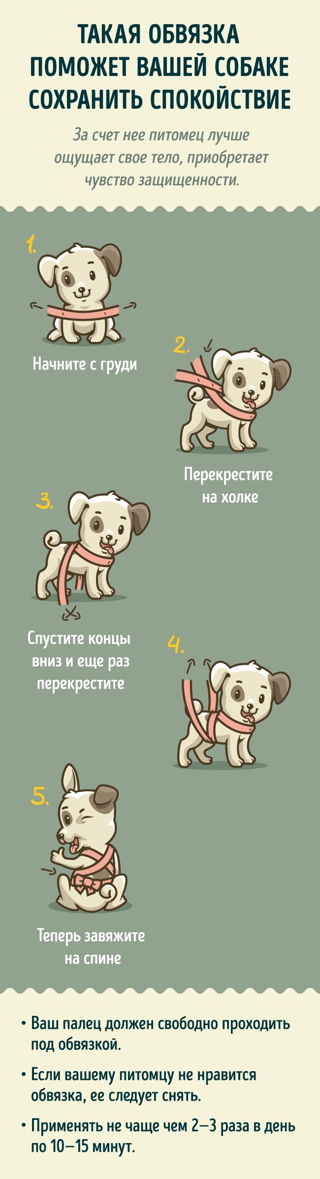 Є один простий і перевірений спосіб заспокоїти собаку. Полягає він у тому, щоб зробити навколо тіла вихованця обв'язку з тканини або еластичного бинта. Завдяки легкому тиску у собаки створюється відчуття захищеності, вона набуває впевненості в своїй поведінці і рухах.