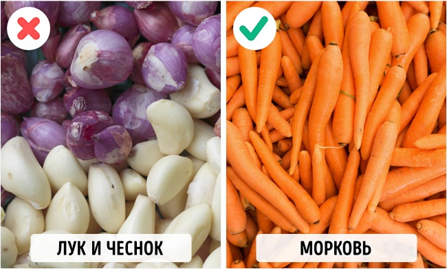 Цибулю і часник дратують слизову шлунково-кишкового тракту собаки і можуть негативно позначитися на її нюху. Крім того, в цих продуктах містяться токсичні для собак речовини, що може призвести до гострого отруєння і навіть смерті. Краще замінити цибулю і часник морквою, яка, крім того що містить багато вітамінів, є чудовою «зубною щіткою» для собаки.