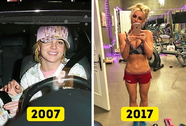 У 2007 році Брітні Спірс у стані нервового зриву поголила себе наголо, після чого потрапила в реабілітаційну клініку. У 2017 році вона у відмінній формі.