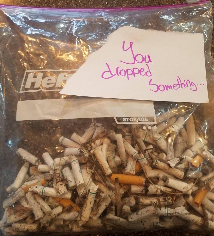 17. «Сусіди постійно кидають недопалки на вулицю. Мені набридло, що собаки їдять їх, а діти грають з ними. Так що я вирішив повернути недопалки власникам»