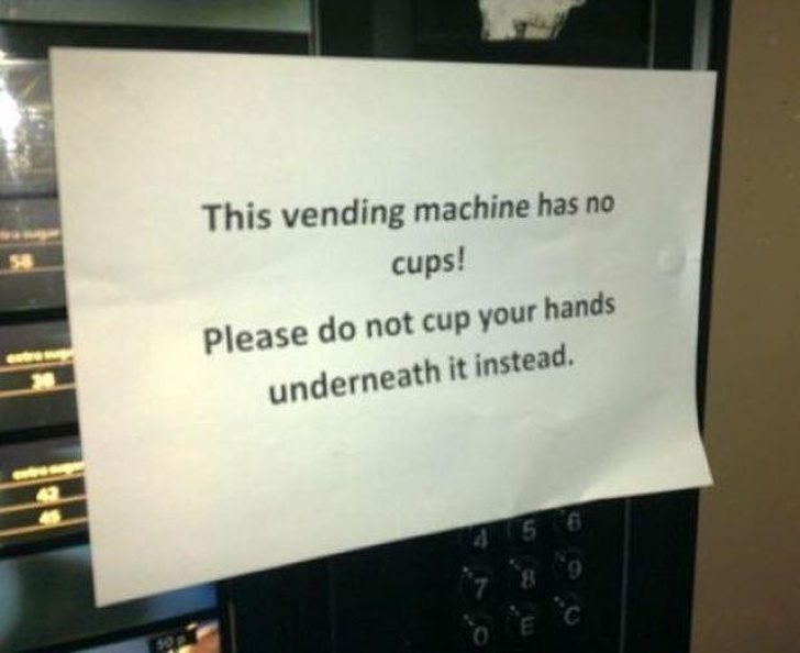 «У вендінговому автоматі немає склянок! Будь ласка, не підставляти руки замість них».