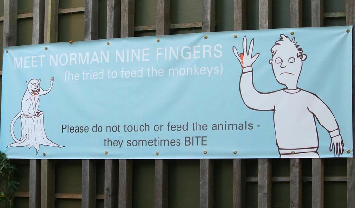 «Знайомтеся, хлопця праворуч звуть Норман — дев'ять пальців (він намагався погодувати мавп). Будь ласка, не чіпайте і не годуйте тварин — вони іноді кусаються».