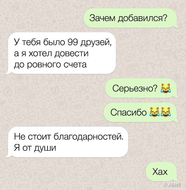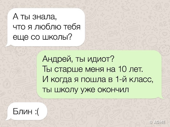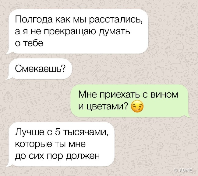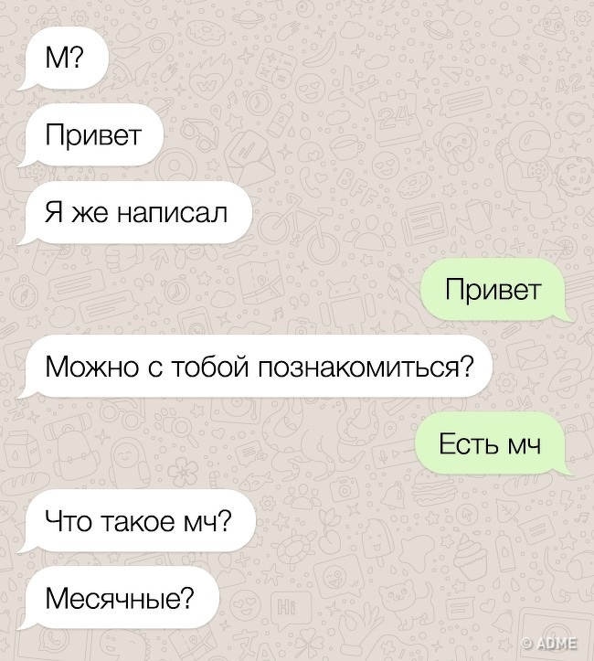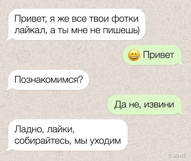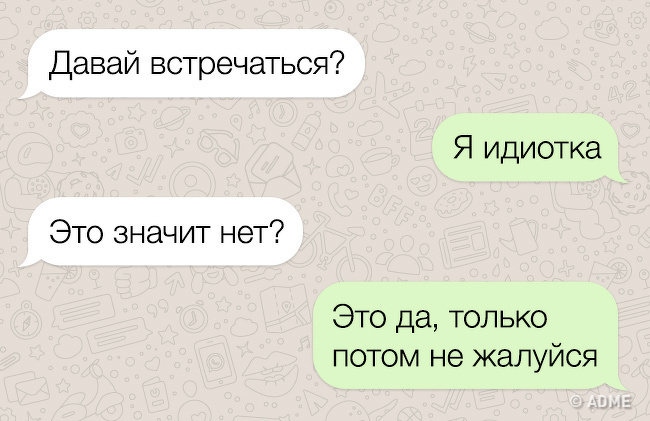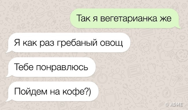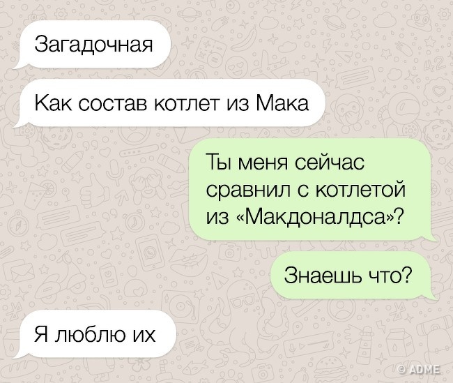 Кожен, хто хоч раз пробував себе у нелегкій мистецтві флірту, тим більше СМС, знає, як непросто буває підібрати по-справжньому цепляющие слова. Начебто сказав, що вона навіть краще найулюбленішою котлети з Макдоналдса, а вона образилася. Наставив лайків, а вона не згодна йти на побачення. Як у таких ситуаціях зберігати обличчя і не відступати? Герої нашої сьогоднішньої добірки знають відповіді на ці питання.