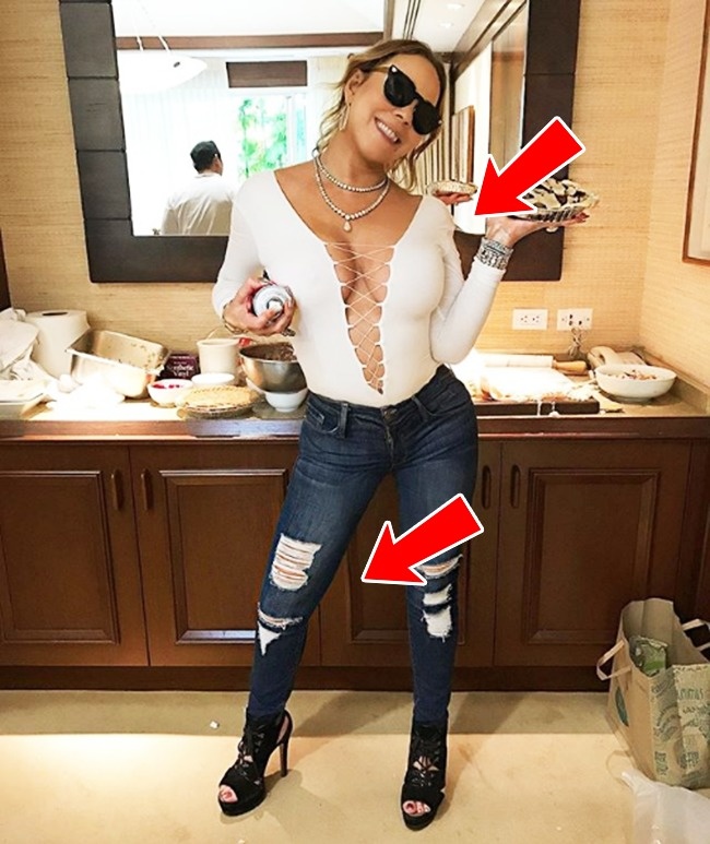 Мерайя Кері ніколи не боялася відвертих нарядів і, здається, любить себе саме такий. Правда, вона, як і багато знаменитостей, вдається до хитрощів і для більшої витонченості коригує зону плечей, подовжує шию і робить ноги стрункішими.