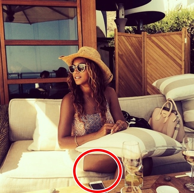 У самої стрункої фотомоделі ноги в такому ракурсі можуть вийти повніше, ніж вони є насправді. І, незважаючи на те, що Бейонсе завжди пишалася своїми формами, вона коригує задню частину стегон. Це помітили завдяки вигнутому телефону на столі.