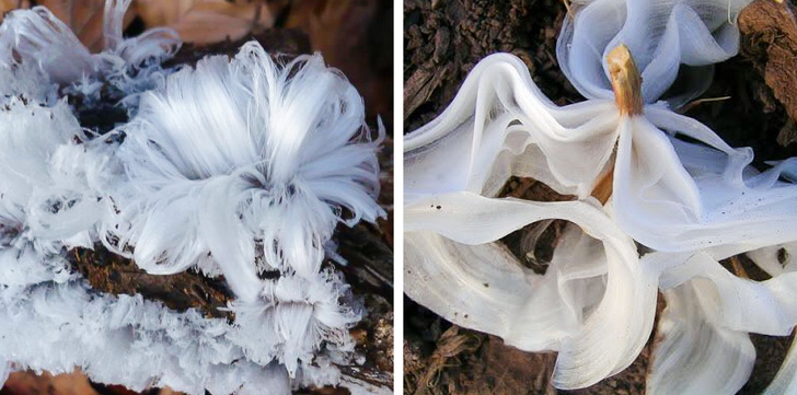 1. Це явище називається «крижані волосся». Виникає на обломанных гілках при заморозках. Лід набуває незвичайну форму через вологи у деревині і мікроскопічних грибів