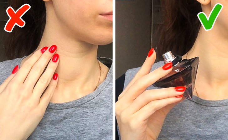 Щоб парфум тримався довше, досить дотримуватися лише одне правило: у жодному разі не розтирати духи по шкірі. Це лише зменшує час дії аромату, змінює послідовність розкриття запахів і руйнує верхні ноти парфумів. Справа в тому, що під час тертя виділяється тепло, з-за якого найбільш леткі компоненти випаровуються швидше за інших.