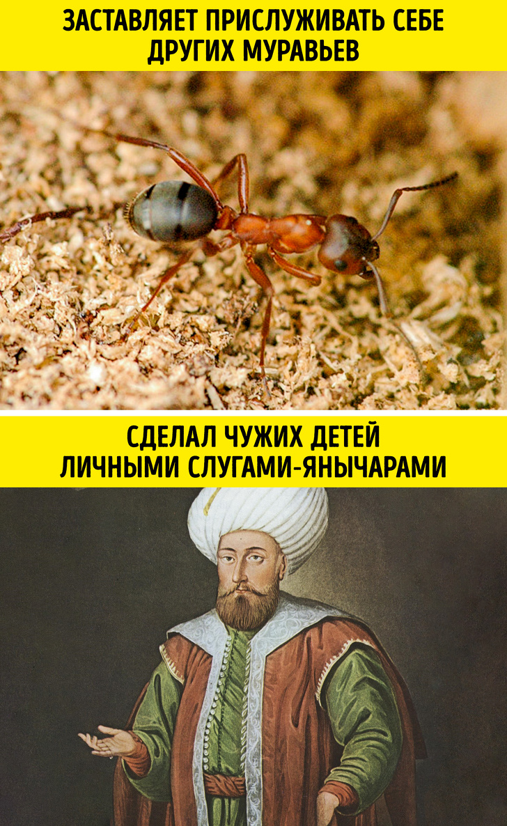 Після перемоги мурашки діють з цинічністю османів, перетворювали поневолених дітей своїх відданих слуг-яничар. Вони переносять чужі яйця в рідне гніздо і вирощують з них слухняних своєї волі працівників.