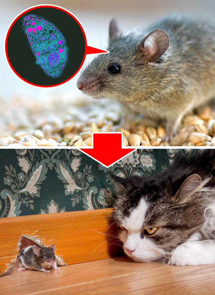 До третини всіх людей - носії токсоплазмозу. Вважається, що він не представляє небезпеки для людини, хоча деякі вчені все ж пов'язують його з підвищеним ризиком невротизму і шизофренії. Люди заражаються цим паразитом від кішок, а вони - від мишей. Уражена токсоплазмою миша перестає відчувати страх перед запахом когтистого хижака і сміливо виходить назустріч своїй загибелі. Причому ці зміни в мозку є незворотними: навіть дивом виживши і одужавши, миша відтепер вважає запах кішки привабливим, а не страшним.