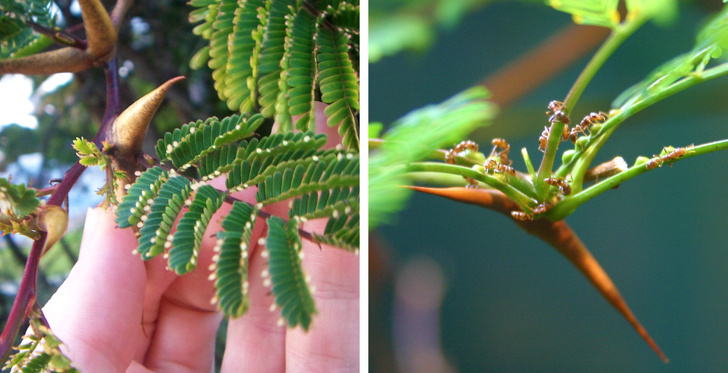 Щоб залучити до своєї рослинної особи мурах, акація надає їм комфортабельне житло в шипах і підгодовує їх нектаром. За це мурахи служать їй особистими охоронцями, кидаючись на підступають до дерева ссавців тварин і люто кусаючи їх.