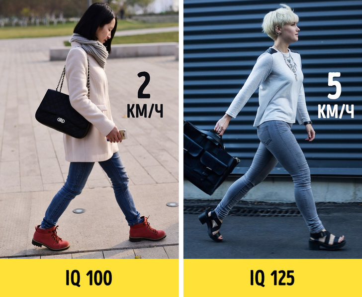 Між рівнем інтелекту і швидкістю ходьби є прямий зв'язок: швидкі кроки позитивно впливають на когнітивні здібності людини. Виявилося, що у людей, які ходять швидко, рівень IQ в середньому на 16 балів вище, ніж у тих, хто воліє рухатися неспішно.