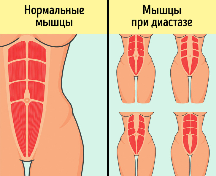 Після пологів нерідко відбувається розбіжність м'язів передньої стінки, яке робить цю зону як би роздвоєною і видатної вперед (особливо це помітно після їжі, коли ви почали з «з'їм одну печеньку» і несподівано закінчили батоном з ковбасою і пельменями).