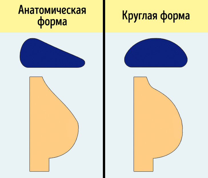- Форма. Форма може бути кругла або анатомічна. Анатомічна виглядає дуже природно і красиво. Якщо правильно підібрати профіль імпланта, об'єм грудей у верхній частині з анатомічними імплантами буде не гірше, ніж з круглими. Круглі рекомендую, якщо ви активно займаєтеся професійним спортом і є ризик того, що імпланти будуть перевертатися. Якщо круглий перевернеться - ви не помітите, а от якщо перевернеться анатомічний, то груди як мінімум буде дуже смішний.