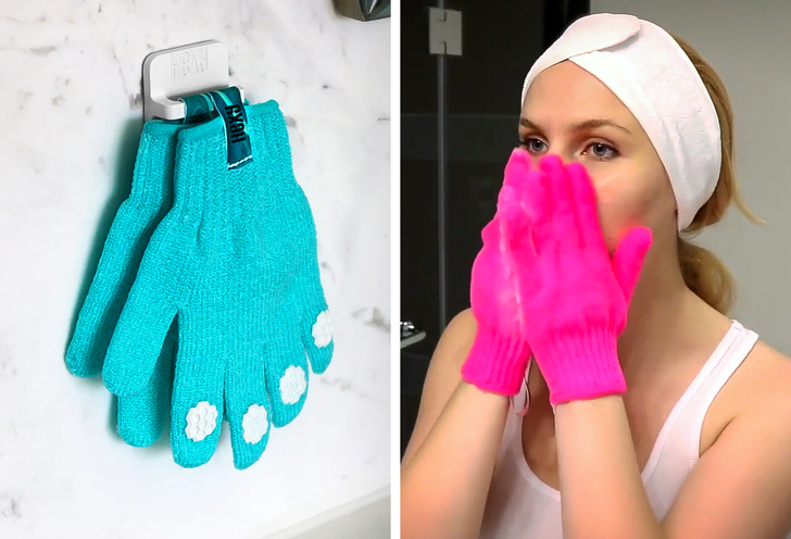 На ці рукавички прикріплені силіконові присоски, які забезпечують вакуумну чистку пір.