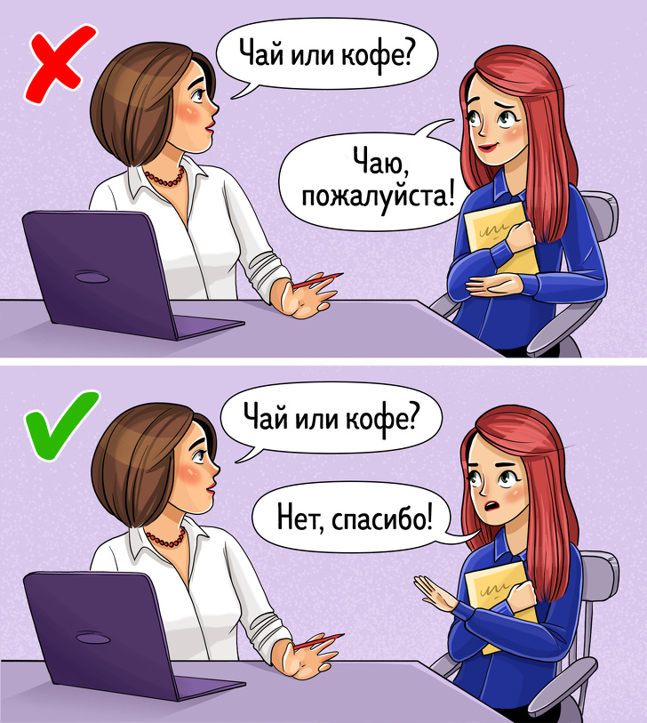 Якщо на співбесіді вам пропонують чашечку кави або чаю, орієнтуйтеся по ситуації. Якщо є секретар, який його приготує, то має сенс погодитися, якщо ні — краще відмовитися, тому що рекрутеру не потрібно витрачати дорогоцінний час на приготування кави.