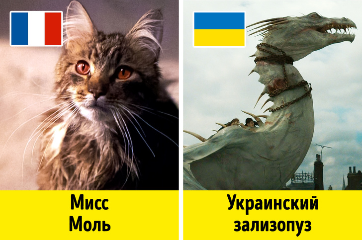 Французи вирішили перейменувати кішку Филча Місіс Норріс в Міс Моль або Міс Лишай (Miss Teigne (Міс Тэнь) — це слово також має значення «злюка, відьма»). А дракон породи українська железобрюх мовою своєї батьківщини виявився українським зализопузом.