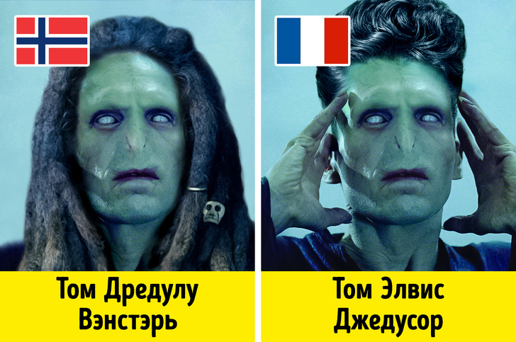 Французи, щоб прийти до фрази «Я лорд Волдеморт» (Je suis Voldemort), назвали персонажа Тому Елвіс Джедусор (Tom Elvis Jedusor, де je du sour — це «загадка долі», fate riddle). З тих же причин в Греції Темного лорда звуть Антон Морволо Хурт (Anton Morvolo Heart), в Данії — Ромео Р. Детлев — молодший (Romeo Gåle Detlev Jr), в Норвегії — Те Дредулу Вэнстэрь (Tom Dredolo Venster). У Словенії вирішили і зовсім переробити обидва імені: Марк Нелштейн (Mark Neelstin) стає лордом Мрлакенштейном (Lord Mrlakenstein).
