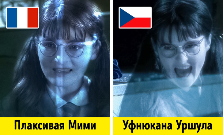Ще кумедніше для російськомовної аудиторії звучать варіанти імені Плакси Міртл. Для французів вона Плаксиве Мімі (Mimi Geignarde), а для чехів — Уфнюкана Уршула.