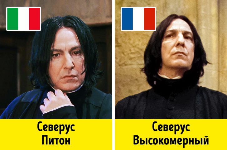 Італійський перекладач, тим не менш, вважав відсилання до змії важливою і назвав персонажа Северус Пітон (Severus Piton). Угорці поміняли ще й ім'я — Першелус Пітон (Perselus Piton), щоб зберегти альтерацію перших літер. А у Франції професора зіллєваріння називають Северус Зарозумілий (Severus Rouge).