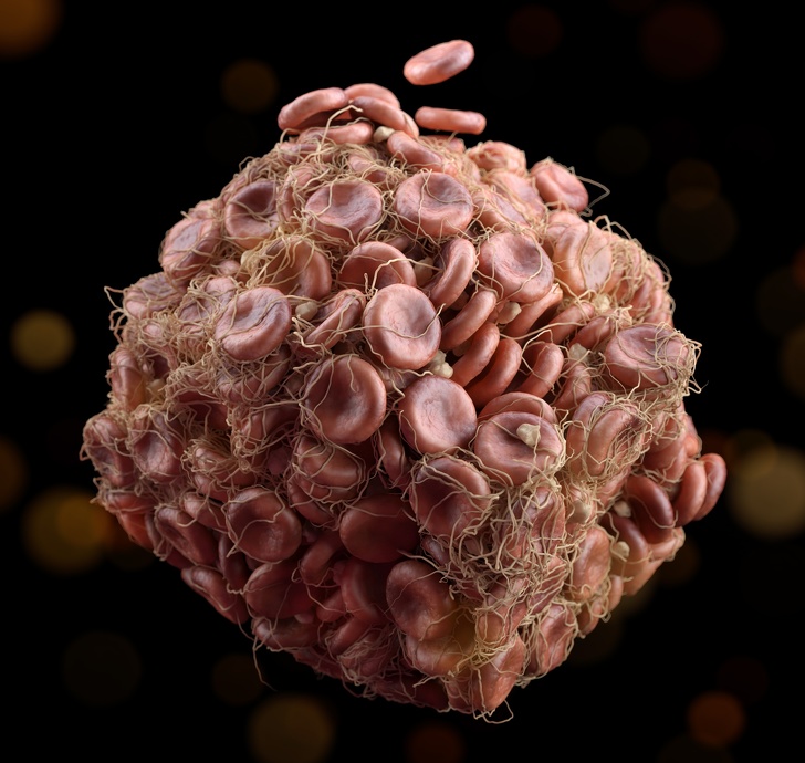 Білі волокна — це білок фібрин, який змушує кров згортатися і зупиняє кровотечу. Навколо нього — рожево-червоні еритроцити, а білі крихти — тромбоцити, які «закривають» рану і прискорюють загоєння тканин навколо неї.
