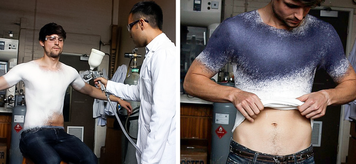 Лондонські вчені розробили суміш з полімерів, яку можна наносити на шкіру. Тверднучи, такий одяг приємно облягає тіло, а на дотик нагадує повсть. Люди, яким пощастило носити перші зразки, відзначають, що футболку з розпиленого матеріалу можна зняти так само, як і звичайну. До того ж вона набагато міцніша.