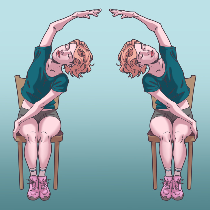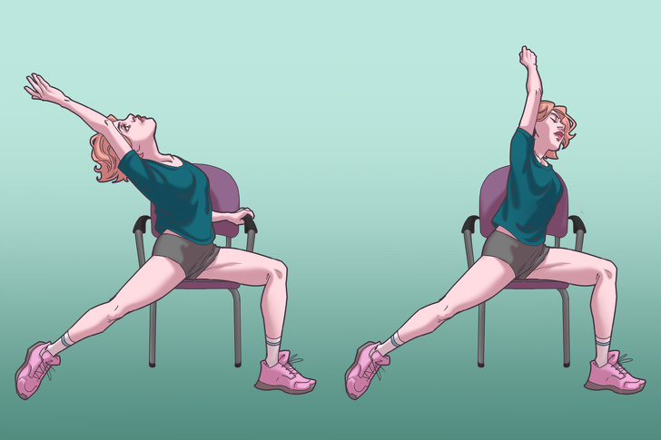 - На видиху поверніться у вихідне положення, потім отклонитесь до спинки стільця, розтягуючи правий бік, рукою тягніться по діагоналі вгору.