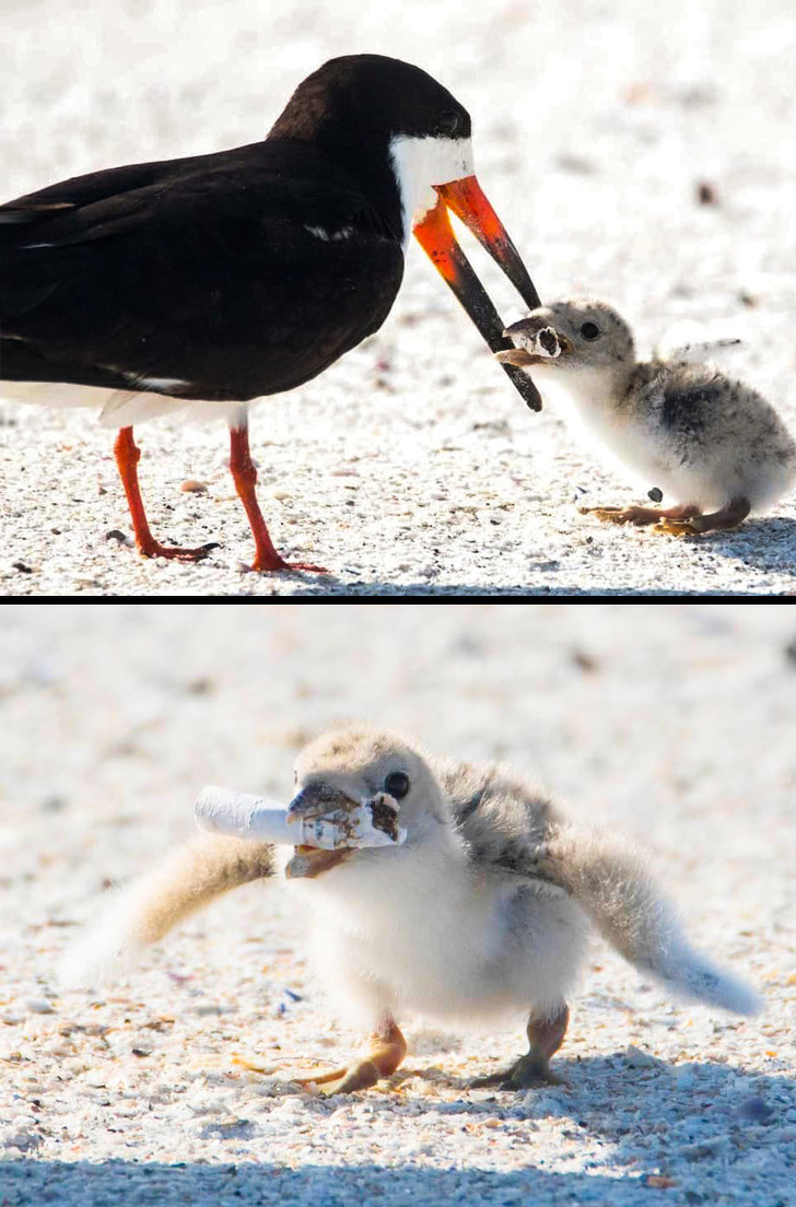 1. Птах годує свого пташеня сигаретним недопалком на пляжі