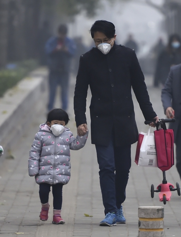 3. Батько і дочка йдуть по одній з вулиць Пекіна. З-за стрімкого зростання промислового місто страждає від щільного смогу, а маски стали частиною повсякденного життя