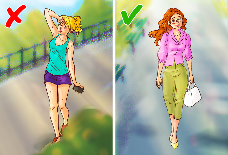 - Надягати короткі обтягуючі шорти і майки в спеку. Поступаючи таким чином, ви підставляєте тіло під прямі сонячні промені. Воно нагрівається і починає виділяти піт, щоб охолодитися. Як результат — можливість зневоднення. Щоб уникнути цієї проблеми вибирайте вільну легкий одяг. Вона захистить організм від перегріву і шкіру від сонячного впливу. І не забувайте про сонцезахисні засоби. @Nanook133