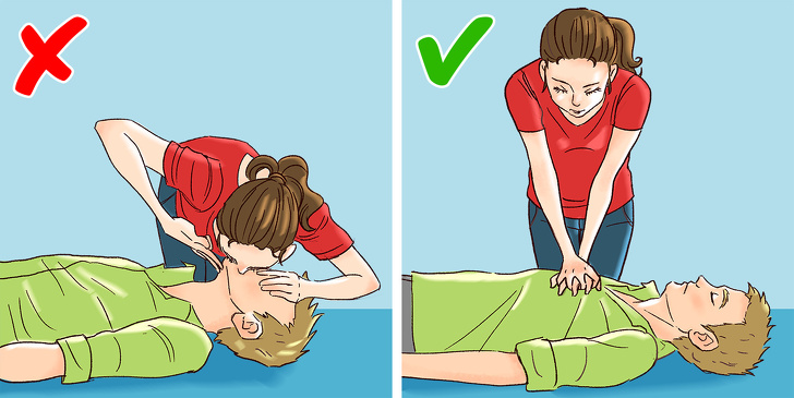 - При зупинці серця відразу починати робити штучне дихання потерпілому. Такі ситуації часто показують у кіно. Насправді, щоб кров почала циркулювати в організмі, потрібно зробити непрямий масаж серця (7-9 разів) і тільки потім робити штучне дихання. @uhuhshesaid