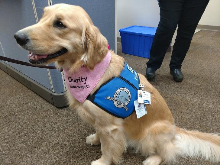 Ця собака є офіційним співробітником лікарні. В її обов'язки входить заспокоєння пацієнтів