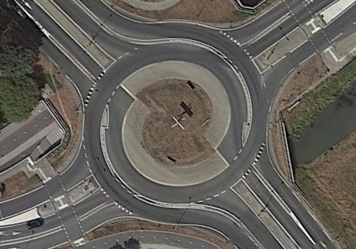 На цій кільцевій розв'язці є прохід, щоб людям не доводилося зупинятися кожен раз, коли хтось їде по дорозі