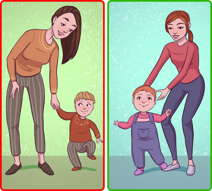 Я проти водіння малюків за руки. Але якщо і робити це, то не більше 15-30 хвилин в день. Не тримайте його за кисті, не задирайте йому руки вгору - так він повисає на ваших руках і не має можливості ловити рівновагу самостійно, а значить, по-справжньому вчитися ходити. Не водіть за одну руку: дитині доводиться задирати ручку, ви порушуєте всю геометрію тільки формується навички ходьби. Найкраще при ходьбі тримати його за корпус ззаду.