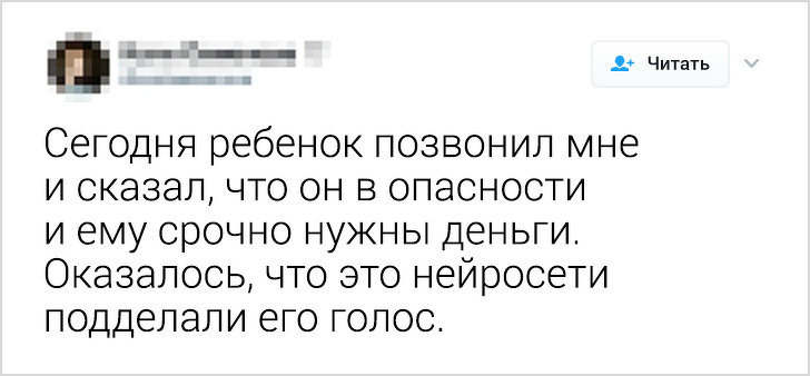 Проблема в тому, що цим досягненням науки цілком можуть скористатися шахраї, якщо їм вдасться роздобути запис вашого голосу. А зробити це цілком реально: дзвінки в лікарні, банки та інші установи записуються і зберігаються. Якщо ці дані потраплять до рук зловмисників, то одного разу ви можете отримати дивний дзвінок від дитини, чоловіка або батьків. Їх голос попросить у вас грошей на щось надзвичайно термінове і важливе.