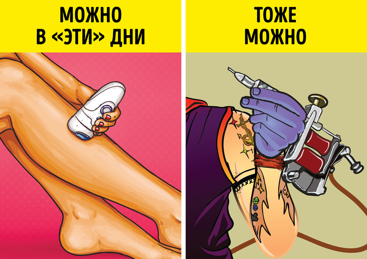 Деякі тату-майстра застерігають своїх клієнток від сеансів під час менструації, бо татуювання може «попливти». Косметологи також не рекомендують робити деякі процедури (наприклад, ін'єкції ботокса). За фактом якість малюнка, як і ефект від процедур, залежить від майстра. Візит в салон в «ці» дні не варто переносити, але пам'ятайте: відчуття можуть бути трохи більш болючими.