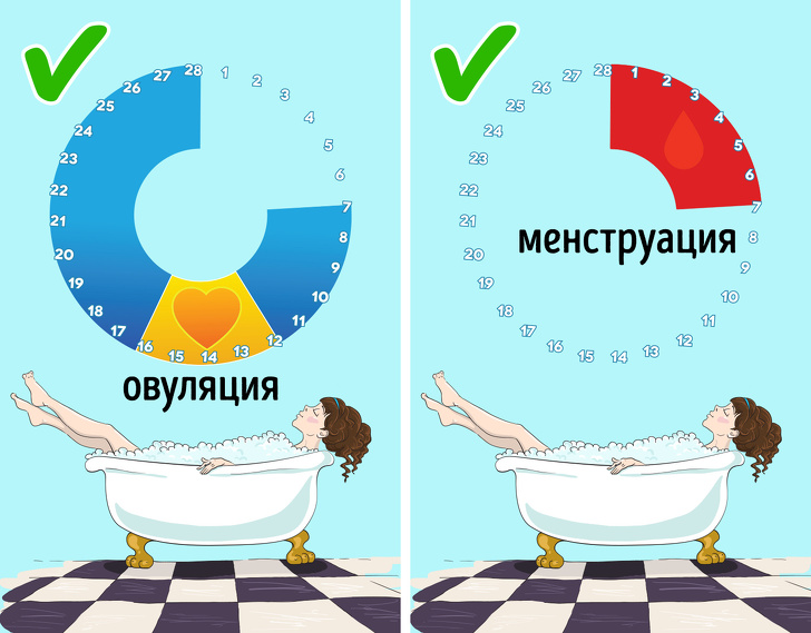 Тепла ванна під час місячних може принести користь. Гаряча вода покращує судинну функцію, розслаблює гладку мускулатуру і послаблює менструальні спазми. Тому цілком ймовірно, що після водних процедур ви відчуєте себе набагато краще. Зрозуміло, попередньо ванну варто ретельно вимити, а якщо все ще турбуєтеся — скористайтесь тампоном.
